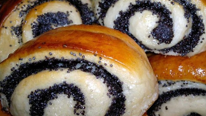 - Shaping the buns: After rising, roll out the dough on a floured surface into a thin sheet. Spread the poppy filling in the middle of the dough, roll up and cut into slices. Arrange the slices on a baking tray lined with baking paper and brush each bun with the beaten egg yolk.