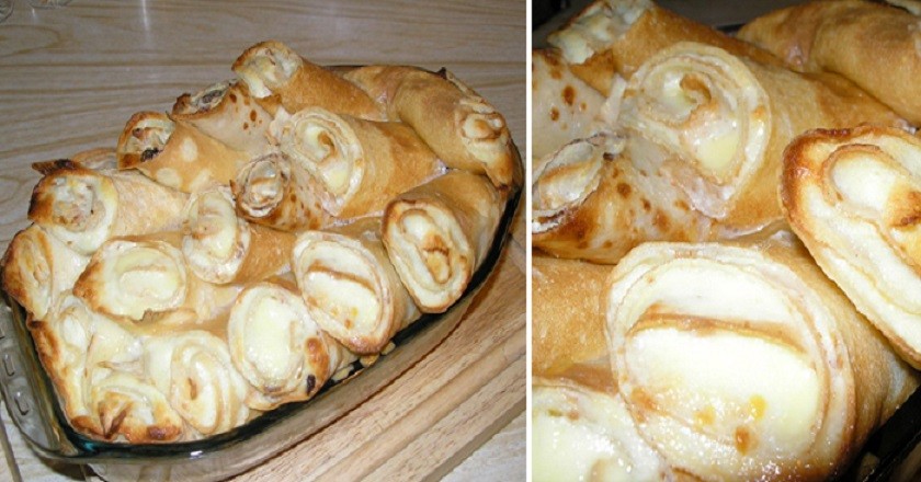 - 5. Baking: Grease a deep dish with butter and arrange the pancakes in it. Prepare a mixture of 100 ml milk, one egg yolk and a tablespoon of sugar, which you will pour over the pancakes.