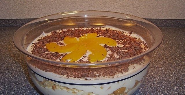 - 4. Assembling the dessert: Crumble the sponge biscuits or butter cookies into smaller pieces. Layer them alternately with the cream and pieces of mandarin in dessert glasses or a bowl.