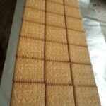 - Line a suitable pan, e.g. a baking sheet, with aluminum foil and arrange the first layer of biscuits.