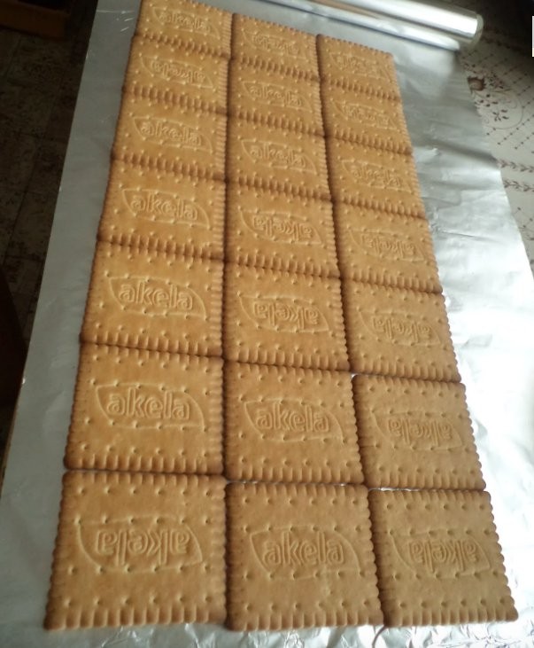 - The last layer is biscuits. Wrap the dessert in aluminum foil and put it in the refrigerator overnight or for at least 2 hours.