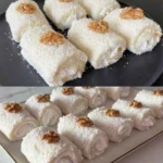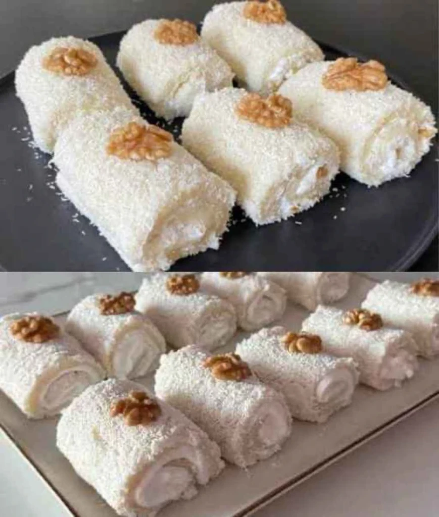 • Finishing the rolls: Spread the cream evenly over the cooled pudding and divide into 12 equal portions. Roll each piece into a cylinder and sprinkle with crushed walnuts. Finally, coat them in grated coconut.