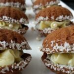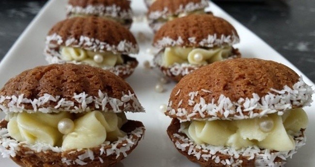- Assembling the shells: Coat the baked shells in coconut. Fill each shell with the prepared egg-yolk cream and place an edible pearl in the center as decoration.