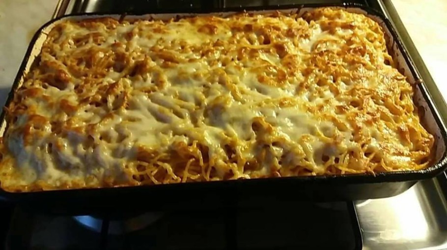 - Now take the pasta, ideally spaghetti. Simply break it in half by snapping and evenly spread it over the baking dish, into the sauce itself. It will finish cooking perfectly in it and will also absorb its flavor. Then all that's left is the cheese, which you sprinkle evenly and generously over the whole mixture. Return everything to the oven and bake until the pasta is perfectly tender and the cheese is melted and begins to brown slightly.