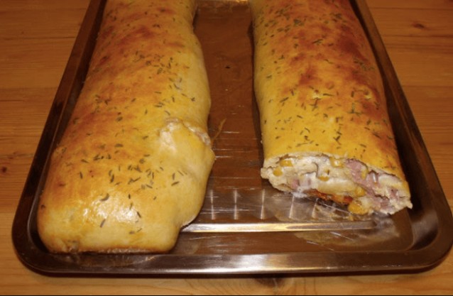 4. Spread the cream mixture over both sheets, place slices of ham, slices of cheese, corn, and grated cheese, and roll up.