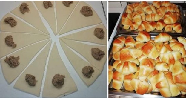• Shaping the rolls: Roll each loaf into a thin circle and divide into 12 triangles. Place a teaspoon of filling on the wider part of the triangle and roll up into a crescent.