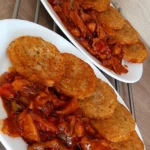 • Sauce base: In the same pan add the chopped onion and the kapia cut into strips. Sauté for about 10 minutes until golden and tender.