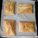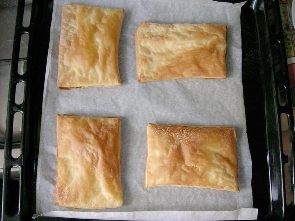 - 1. Dough preparation: Roll out the puff pastry into a rectangle and divide it into four parts. Line a baking tray with parchment paper and bake at 180 °C for 15 minutes. Then let the pastry cool.