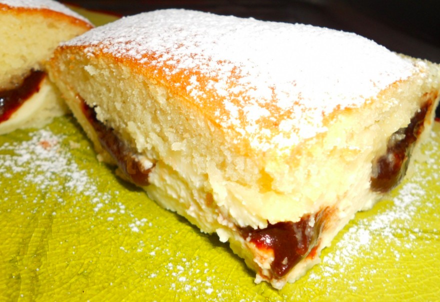 3. Prepare a baking tray measuring 25x35cm, which we line with baking paper. Spread 1/2 of the batter on the tray, then the quark filling on the batter, on which we spoon the plum jam in layers as if we were placing fruit on it.