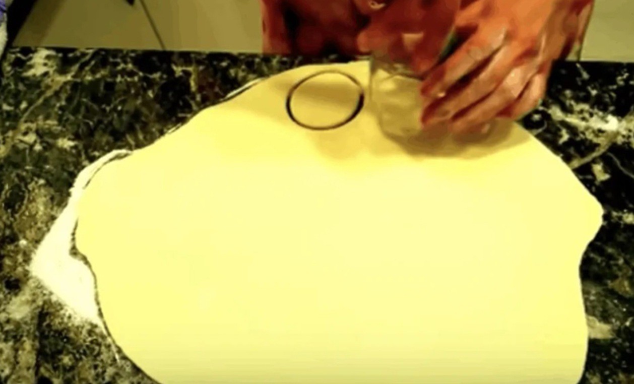 • Roll the dough out into a sheet 4 mm thick. From the sheet cut circles 7 cm in diameter. Immediately coat each circle in sugar, then fold in half, fold in half once more, and coat in sugar again.
