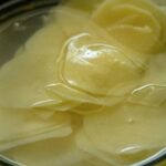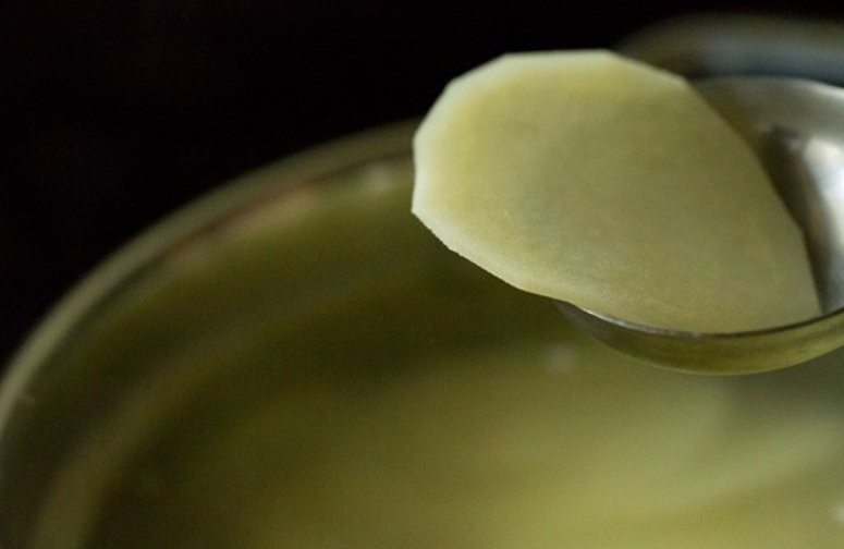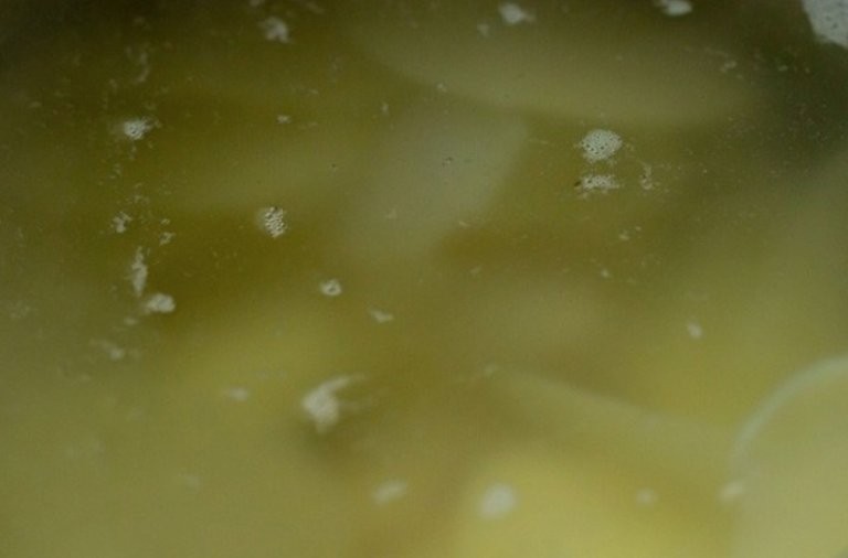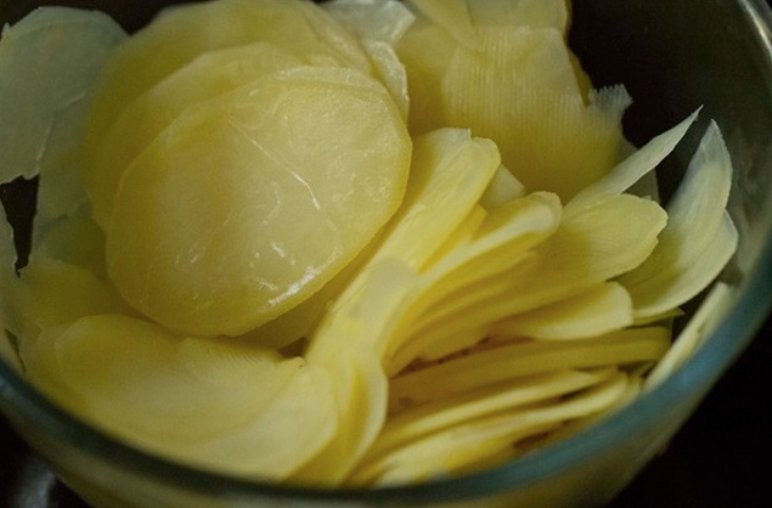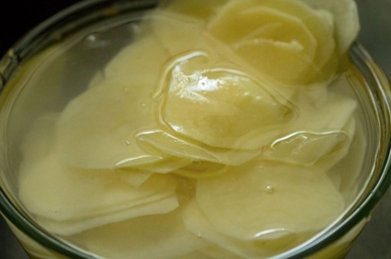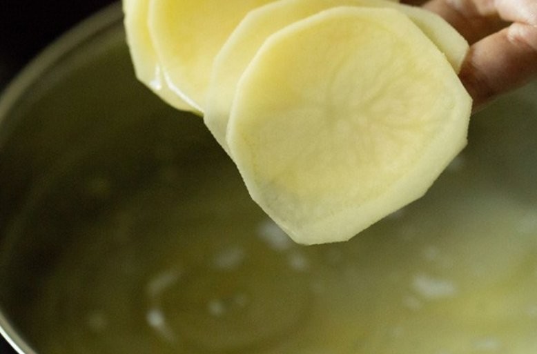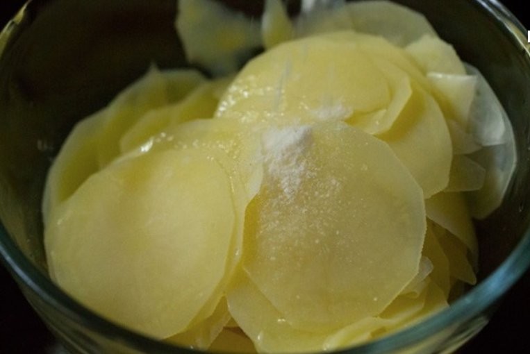 - Mix 3 cups of water and 1 teaspoon of salt in a bowl (for 0.5 kg of potatoes) The salt should be completely dissolved