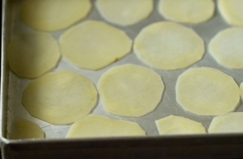 - Line a baking sheet with parchment paper and arrange the individual potato slices. Bake at 250 ° C for approximately 10 to 15 minutes.