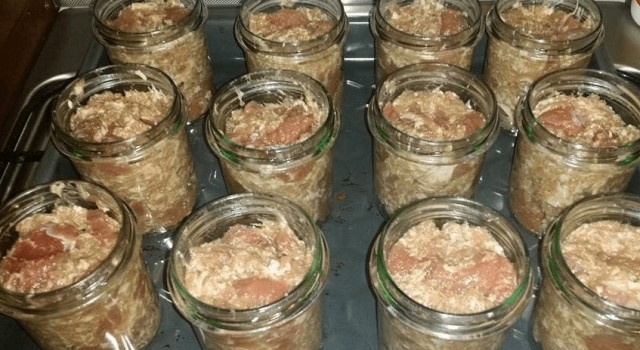 • Then layer it into clean jars. The meat needs to be pressed down in the jars as much as possible (so that as little air as possible remains in the jar)