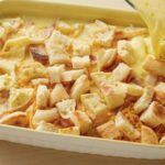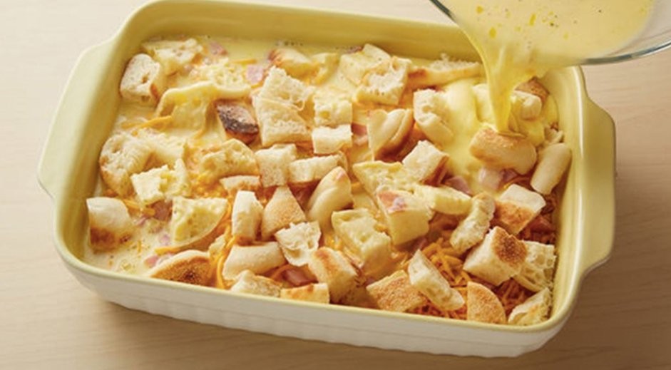 • Mix the bread into the egg mixture.