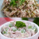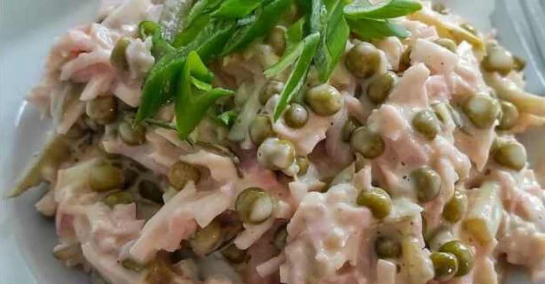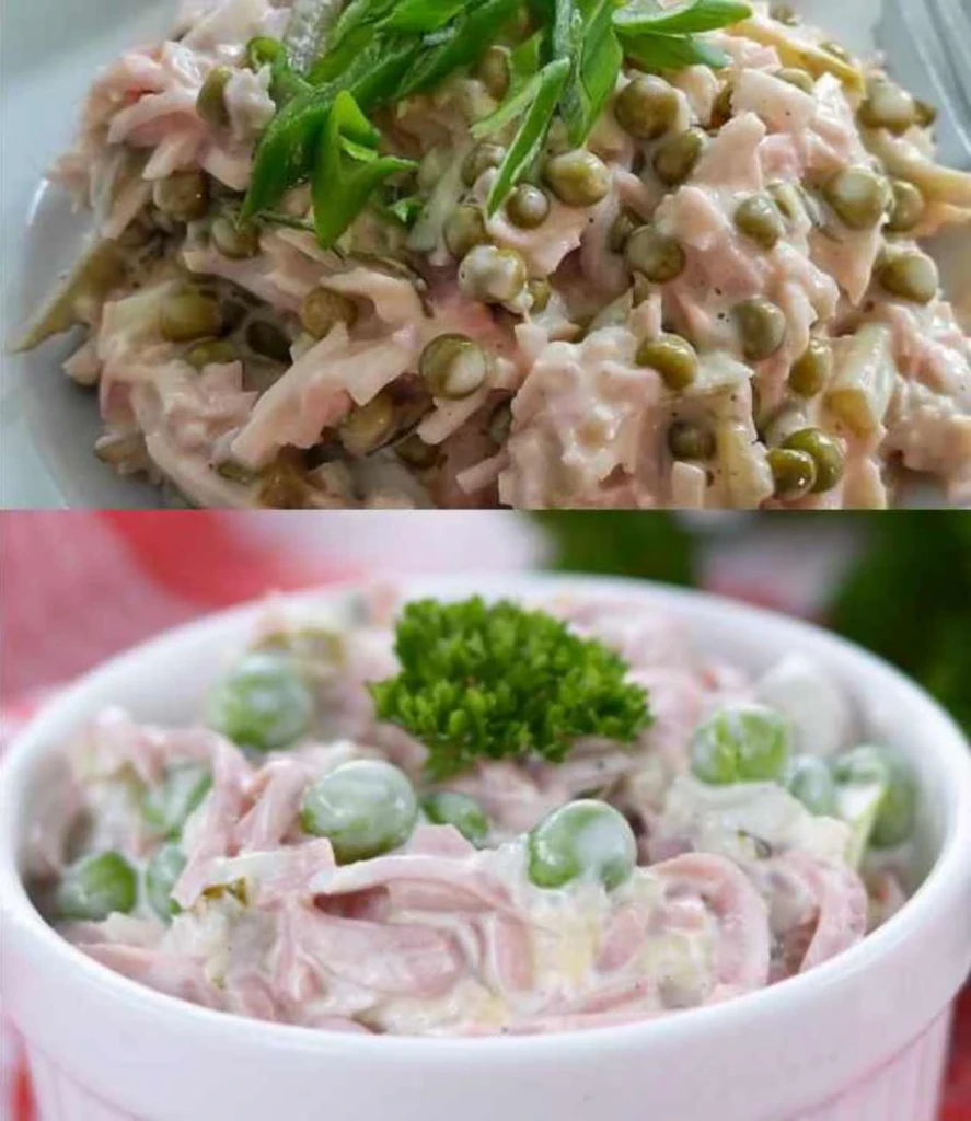 This savory salad is an ideal choice for a quick dinner, a hot sandwich or a picnic. Thanks to the combination of ham salami, crunchy pickles and tender peas with rich mayonnaise and a piquant seasoning, the whole family will enjoy it. Make it anytime you want to liven up an ordinary meal with a delicious addition.