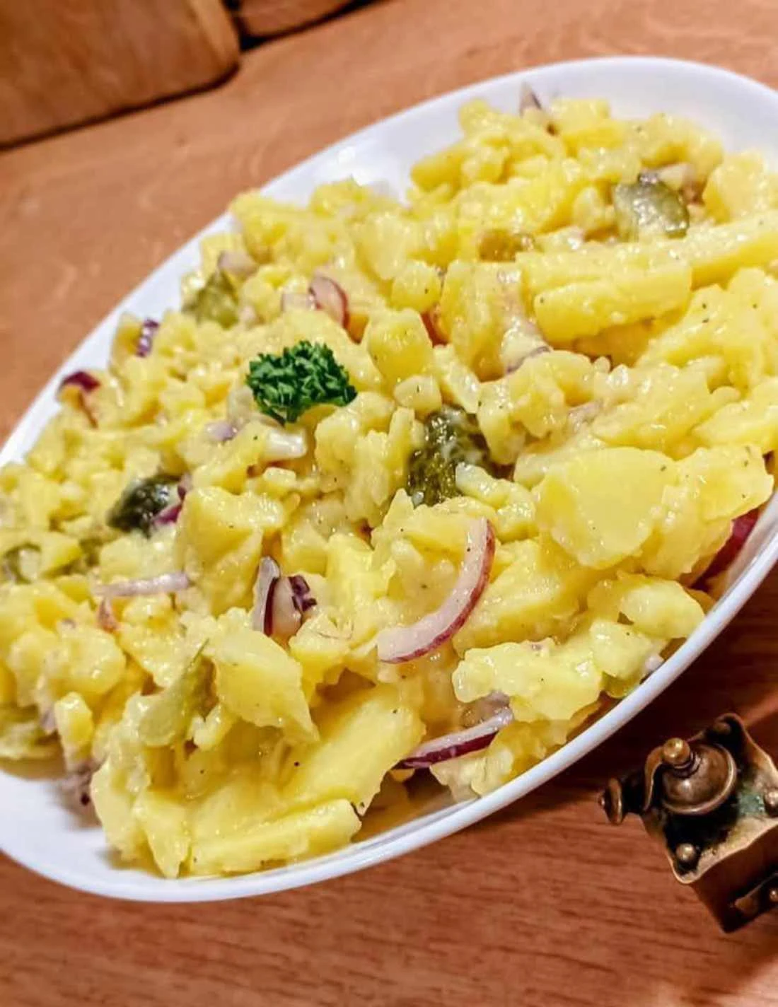• Pour the prepared dressing over the warm potatoes and gently toss.