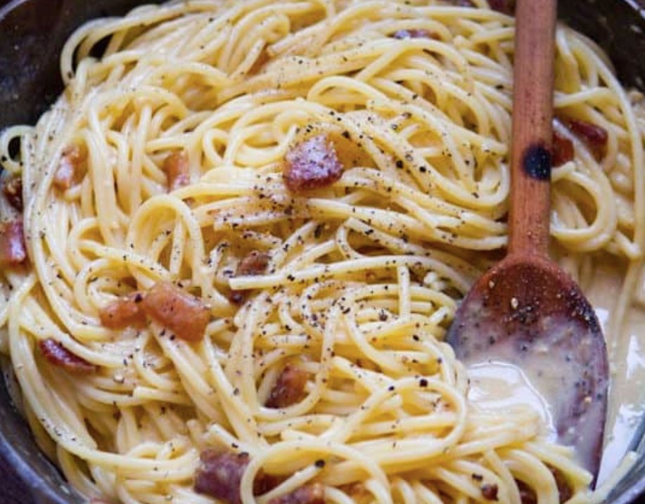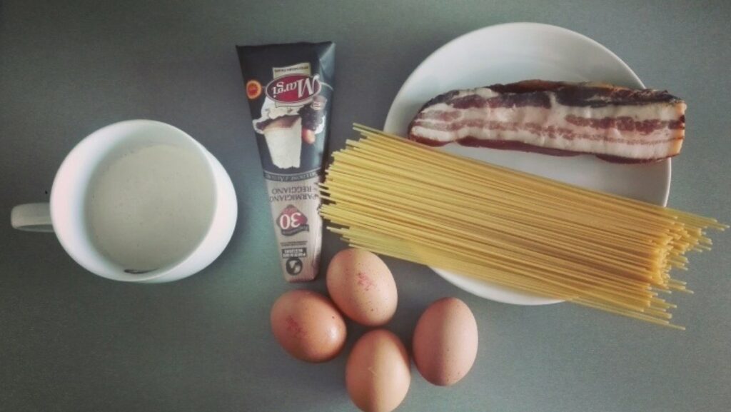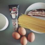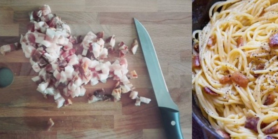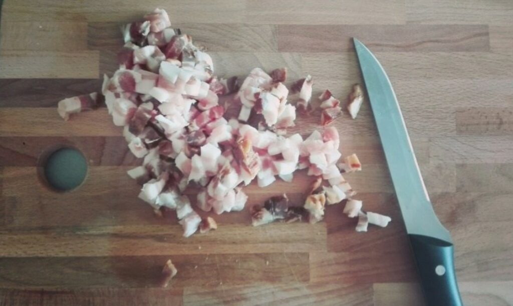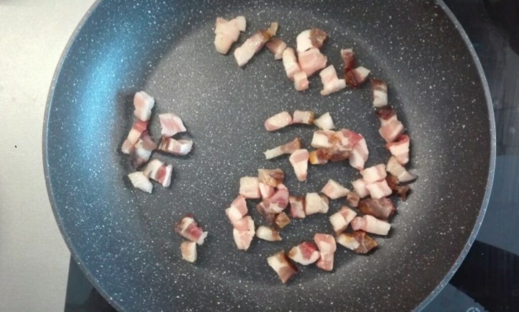 • Pour the cream into the pan with the bacon and let it warm over low heat. The cream must not boil.