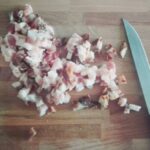 • While stirring constantly, pour this mixture into the cream with the bacon and let it all warm through.