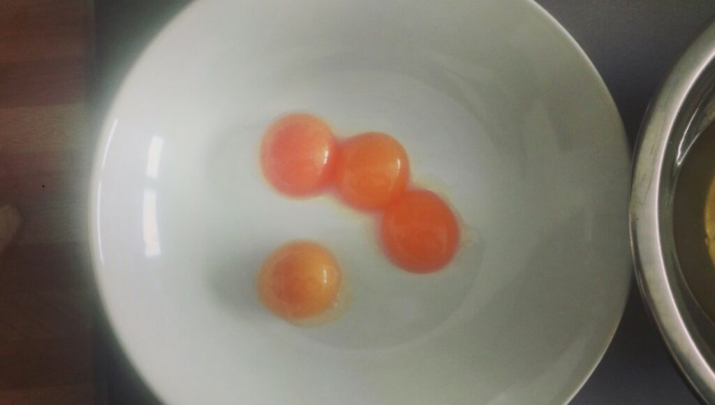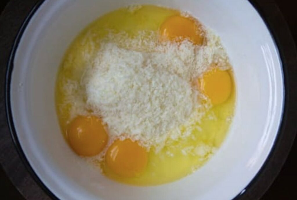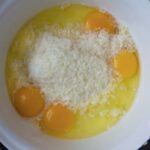 • Add 4 yolks to the Parmesan and mix into a paste. If the paste is too thick, you can add another yolk.