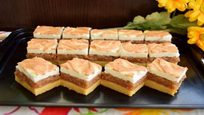 • Finishing: Spread the egg white meringue over the apple layer. You can decorate the surface with patterns using a fork. Return the cake to the oven and bake for another 10 minutes. After baking, let the cake cool completely and then cut into portions.