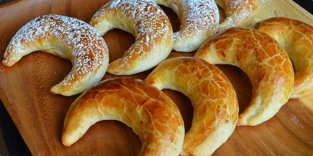 - Shaping the crescents: Divide the dough into the same number of pieces as you have fillings (about 24 pieces). Roll each piece of dough on a floured surface into a thin disc (less than 2 mm). Place a piece of filling on the disc and wrap the dough into a crescent shape. Each roll should have tapered ends.