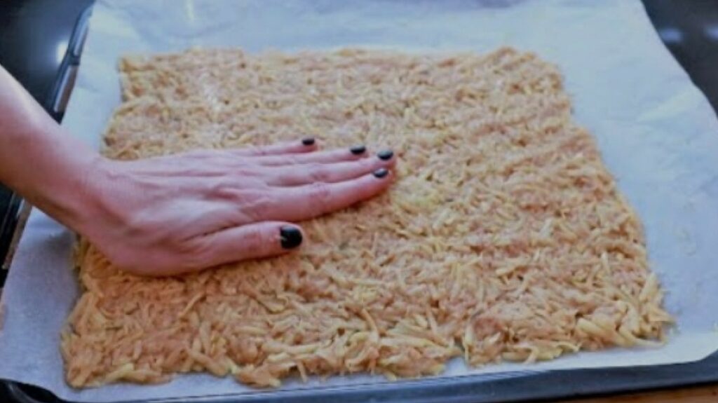 • Line a baking sheet with parchment paper. Brush it with a little olive oil. Spread the potato mixture on it. Shape it well into a rectangle.