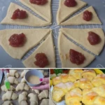 • Shaping the rolls Divide the risen dough into two parts. Roll each part into a circle about 32 cm in diameter and cut into 8 triangles. Place a teaspoon of jam on the wider side and roll up into a crescent shape (croissant).