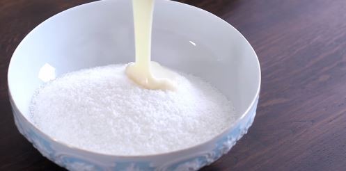- Preparing the coconut layer: In a bowl, mix the condensed milk and shredded coconut. Stir until you have a homogeneous mixture.