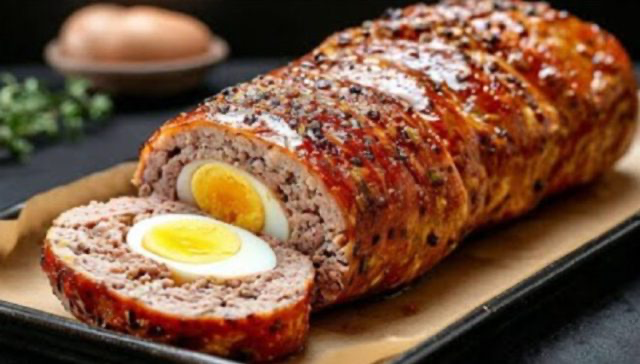 • Preparing the filling: Evenly place the hard-boiled eggs, carrot and peppers in the center of the meat mixture. Then wrap the meat mixture so that the filling is inside. Shape into a roulade.