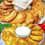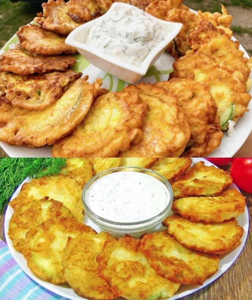 • Serving Arrange the fried zucchini rounds on a plate and serve with the dill dressing. You can add a slice of lemon or a fresh herb as garnish.
