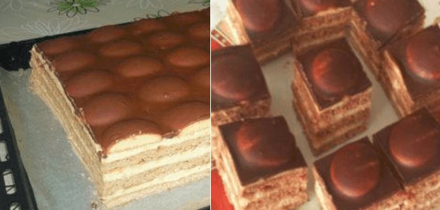 - Preparing the dough: In a bowl, mix all the ingredients for the dough: all-purpose flour, vanilla pudding powder, powdered sugar, softened butter, eggs, baking powder and milk. Work the dough and divide it into 3 equal parts. Roll out each part and bake them in the oven. Bake on a greased and floured baking sheet (30 × 35 cm) for approximately 10 minutes at 150 °C.