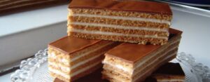 - Preparing the dough: In a bowl, mix all the ingredients for the dough: all-purpose flour, vanilla pudding powder, powdered sugar, softened butter, eggs, baking powder and milk. Work the dough and divide it into 3 equal parts. Roll out each part and bake them in the oven. Bake on a greased and floured baking sheet (30 × 35 cm) for approximately 10 minutes at 150 °C.