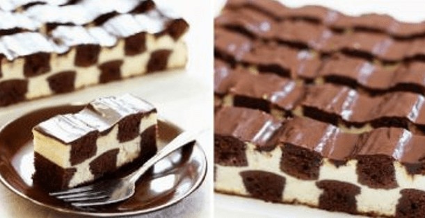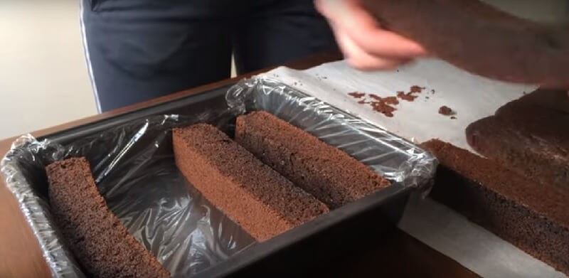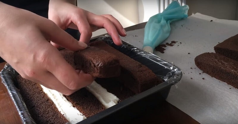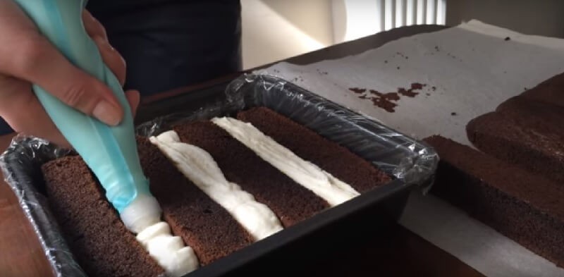 - Assembling the dessert: Cut the cooled chocolate cake into 10 even strips. Line the pan with plastic wrap or parchment paper and begin placing the strips of cake with even gaps between them. Pipe the quark filling between the individual strips of cake. Proceed in layers, applying filling between the first layer of cake and then adding the second layer of cake.
