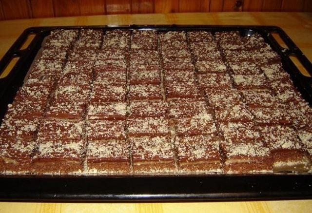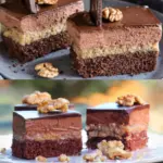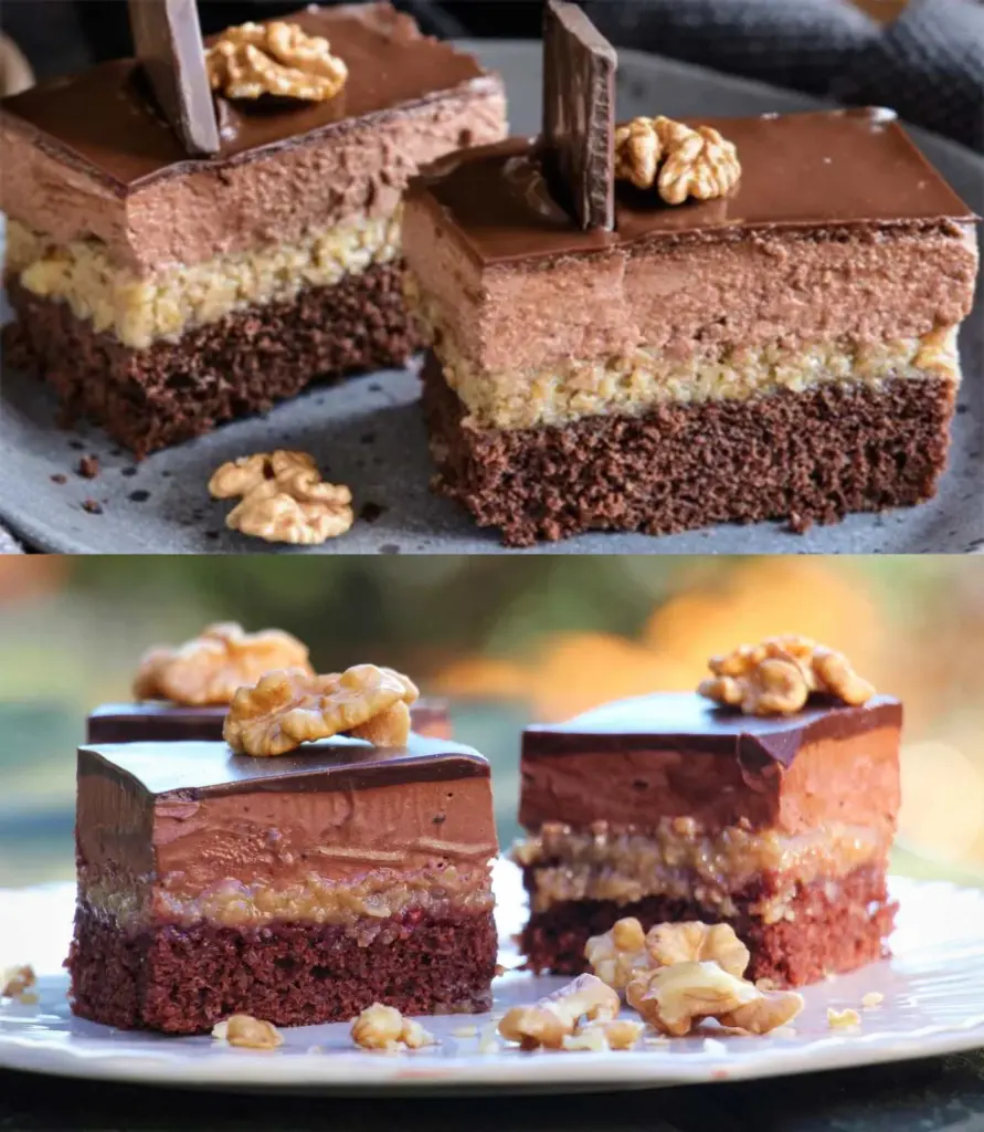 • Preparation of the base Separate the eggs into whites and yolks. Beat the yolks with the sugar until pale and foamy. Add the softened butter and whisk. Fold in the sifted flour, cocoa, baking powder and walnuts. Finally, gently fold in the beaten egg whites with a pinch of salt. Spread the batter on a baking sheet lined with parchment paper (approx. 30×40 cm). Bake for 14–17 minutes at 180 °C. Check with a skewer whether the base is done.