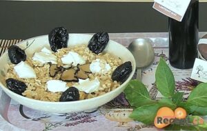 Oat porridge with black truffles, cream, cashews, cheese and plums.