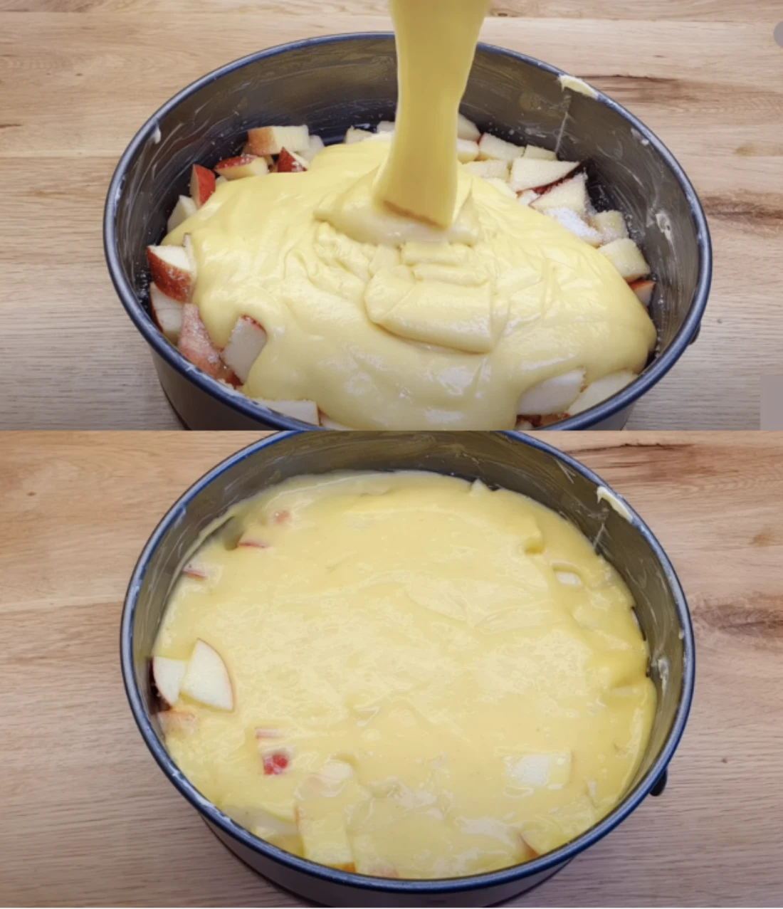 • Baking Pour the prepared batter over the apples and gently smooth it with a spatula. Bake in a preheated oven at 180 °C for about 25–30 minutes. After baking, let cool for 5 minutes and then carefully invert the cake — the apples will be nicely caramelized on top.