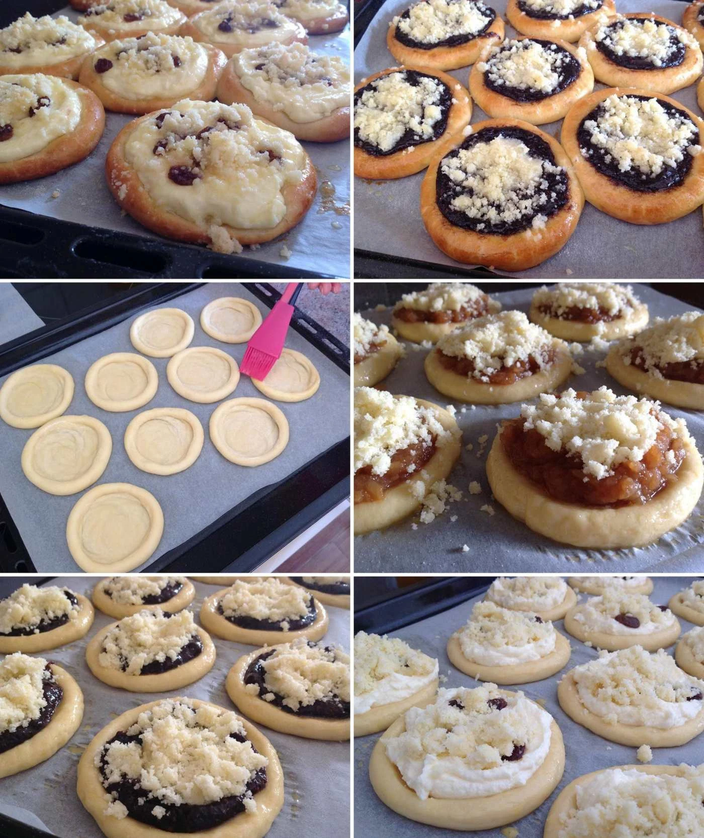 Yeast pastries with streusel are a classic that will please at any celebration or with Sunday coffee. This dough is great to work with, the pastries smell wonderful and thanks to the butter-and-rum finishing they stay beautifully moist. Prepare several types of fillings and let everyone choose their favorite.